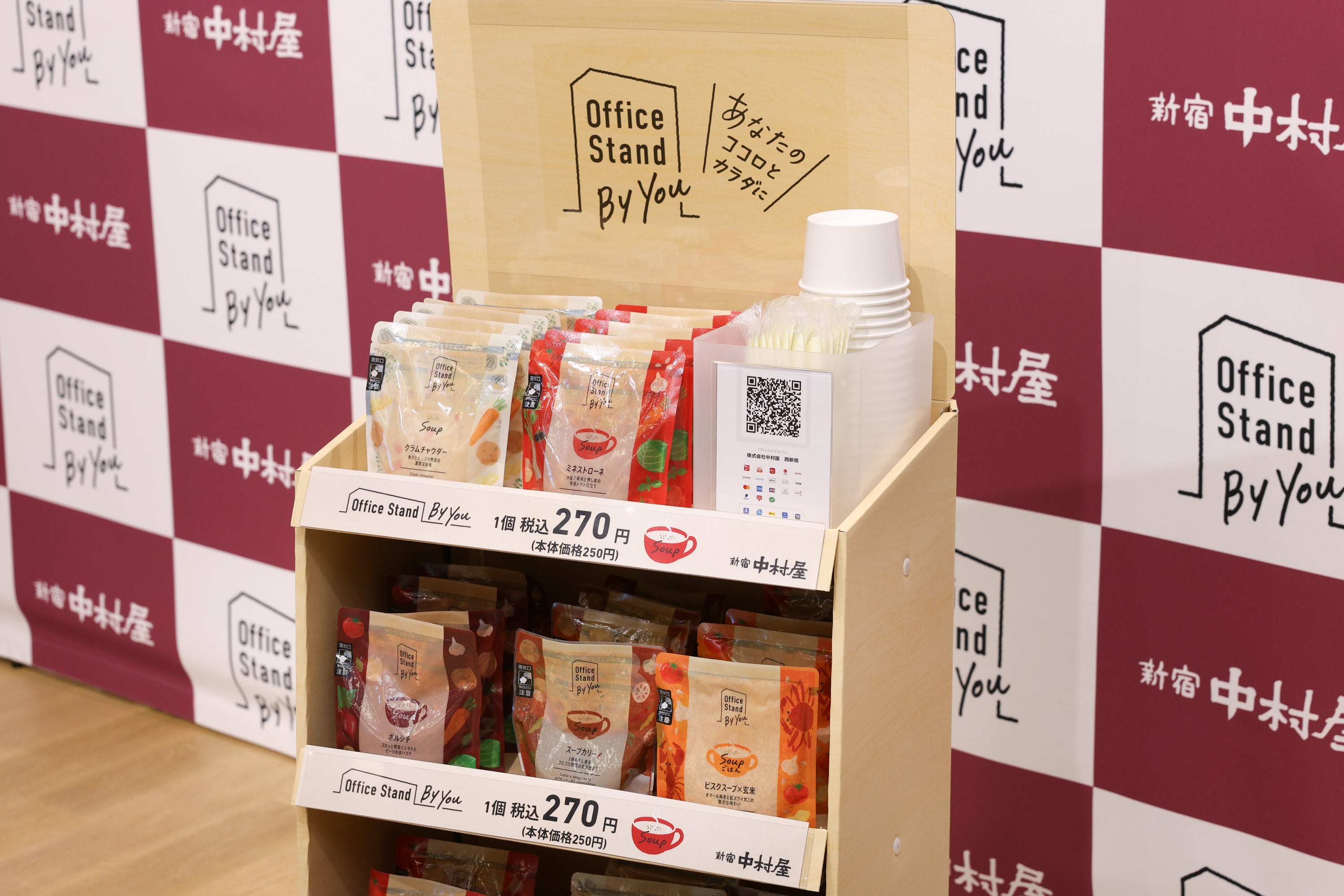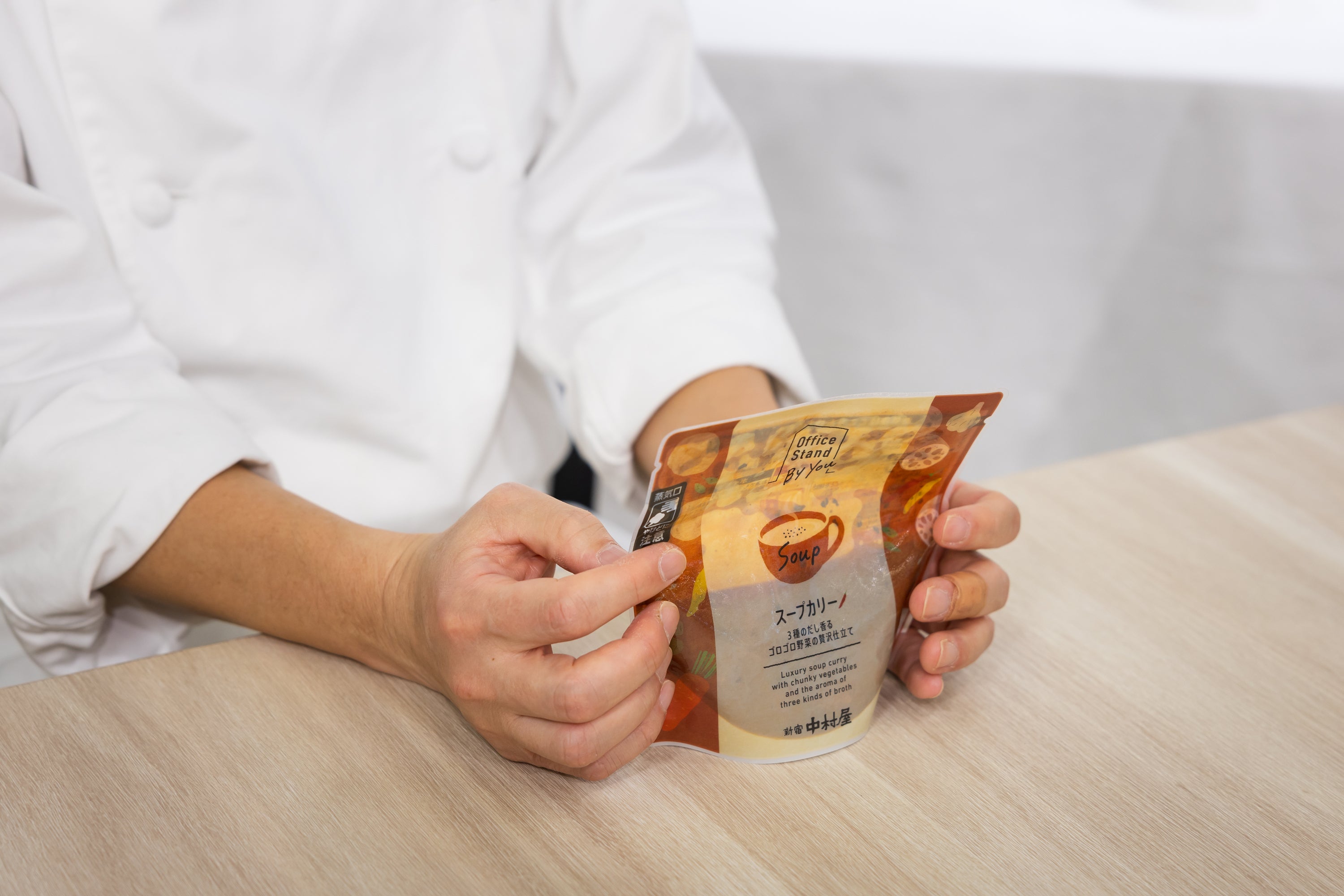 その中村屋が新たな挑戦として⽴ち上げた事業が、「Office Stand By You」です。「Office Stand By You」は、シェフが開発した常温保管が可能なスープを、電子レンジでたった90秒温めるだけで食べることができる、オフィス常設型の社食サービスです。