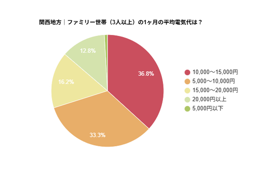 - 関西地方のファミリー世帯の月間電気代は「10,000~15,000円」が36.8%で最多