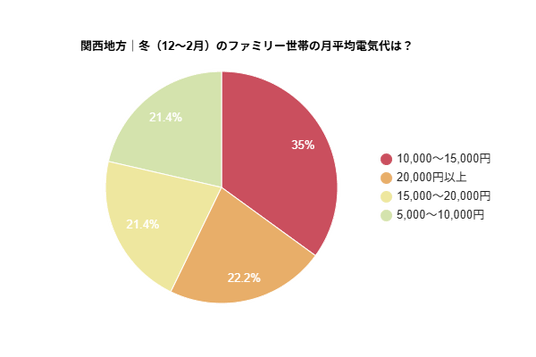 冬の電気代について、関西地方の3人以上のファミリー世帯では「10,000~15,000円」の世帯が35%で最も多い結果となりました。次いで、「20,000円以上」と「15,000~20,000円」の世帯がそれぞれ約2割を占め、暖房や給湯器の使用増加により電気代が高くなる傾向が見られます。