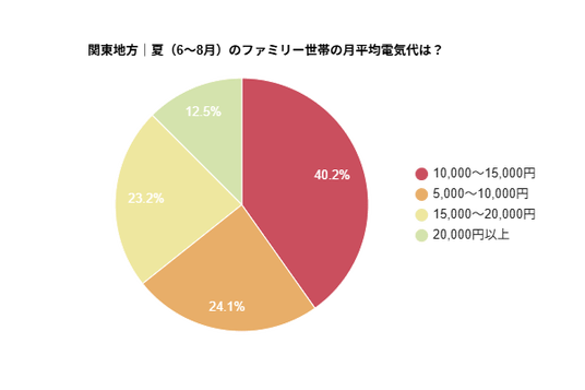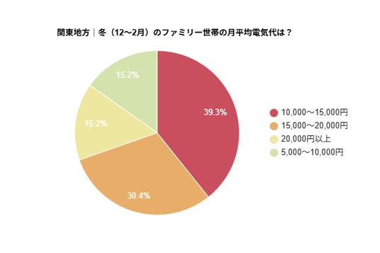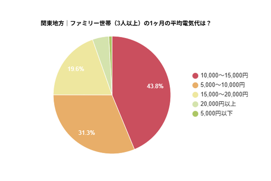 - 関東地方におけるファミリー世帯の月間電気代は「10,000~15,000円」が約4割