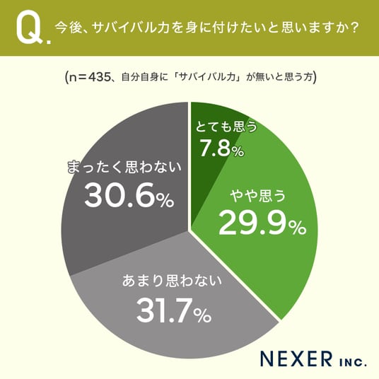 「とても思う」が7.8%、「やや思う」が29.9%となり、合わせて37.7%の方がサバイバル力を身に付けたいと考えていることがわかりました。