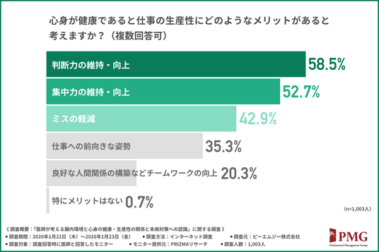 「心身が健康であると仕事の生産性にどのようなメリットがあると考えるか」について尋ねたところ、『判断力の維持・向上(58.5%)』が最も多く、『集中力の維持・向上(52.7%)』『ミスの軽減(42.9%)』と続きました。
