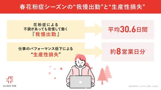 その結果、9割以上が花粉症による仕事のパフォーマンス低下を実感し、花粉症による「我慢出勤」は、春花粉症シーズン中、1人あたり平均30.6日間にのぼることがわかりました。さらに、仕事のパフォーマンス低下によって生じる生産性損失は、1シーズン中1人あたり約8営業日に相当することが判明しました。