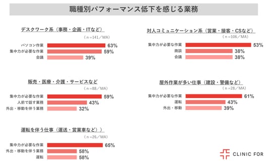 さらに、パフォーマンス低下を感じる業務について主な仕事内容別に分析した結果、職種を問わず共通して「集中力を要する作業」が上位となりました。