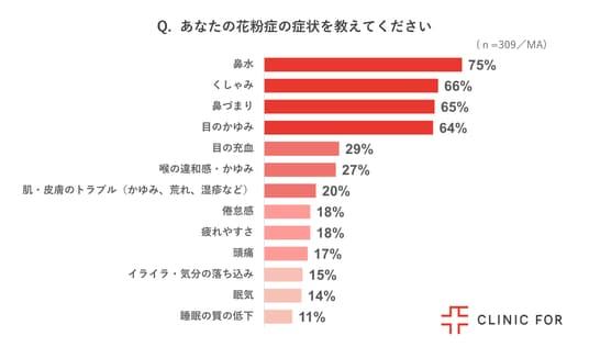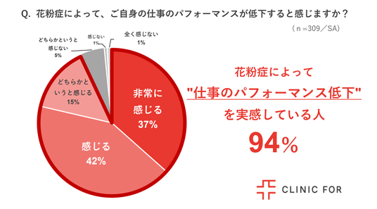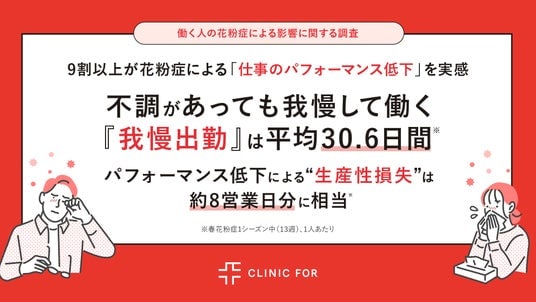 対面診療とオンライン診療を展開する「クリニックフォアグループ」(以下クリニックフォア)は、働く花粉症の人309名を対象に「働く人の花粉症による影響に関する調査」を実施しました。
