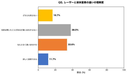 レーザー治療と液体窒素療法の違いを「詳しく説明できる」と回答した方はわずか11.7%でした。54.7%が「違いがわからない」または「どちらも知らない」と回答しており、治療法の違いについての情報発信が不十分であることが浮き彫りになりました。