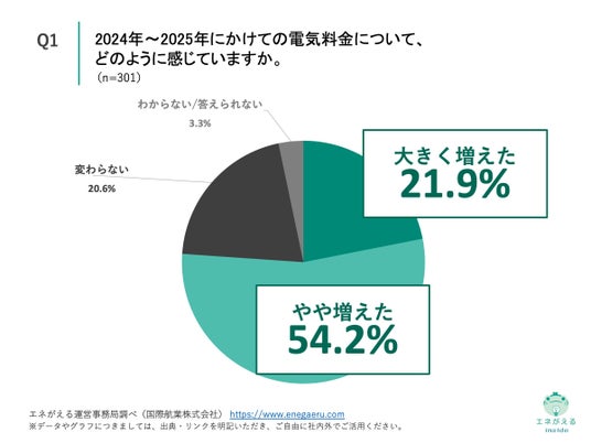 「Q1. 2024年~2025年にかけての電気料金について、どのように感じていますか。」(n=301)と質問したところ、「大きく増えた」が21.9%、「やや増えた」が54.2%という回答になりました。