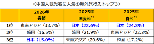 - 2026年の春節期間、中国人観光客に人気の海外旅行先1位は「東南アジア」、2位が「韓国」、3位が「日本」に