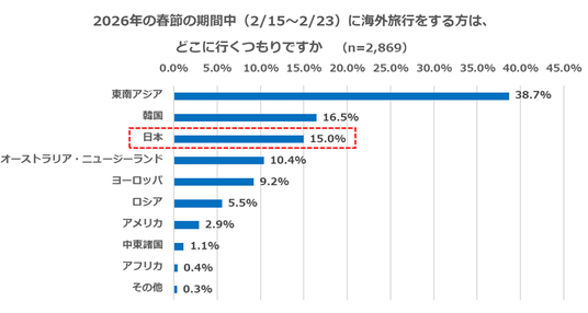 2026年の春節期間の中国インバウンドの動向について、日本への渡航自粛の影響が懸念される中、今回の調査では、海外旅行先として「日本」が15.0%で3位となり、昨年の春節(1位)から9.3ポイント下がる結果となりました。