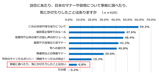 ■「訪日にあたり、日本のマナーや習慣について事前に調べたり、気にかけたりしたことはありますか」(回答数:429人、複数回答)