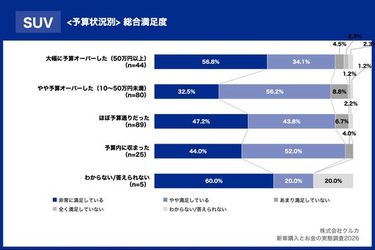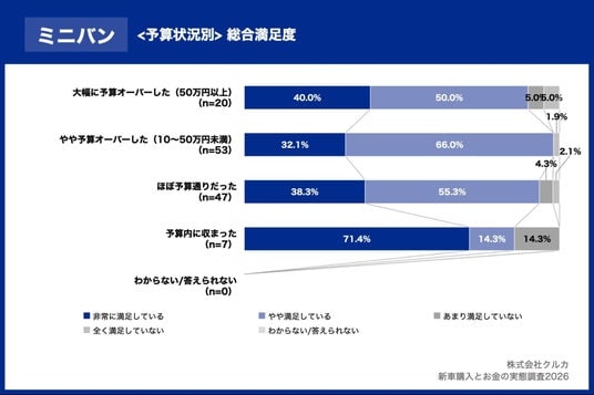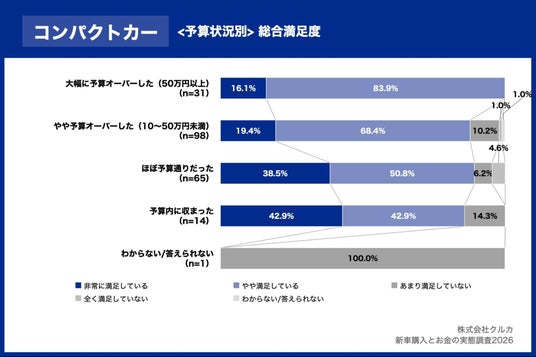 - 03|予算状況別の満足度、大幅な予算オーバーを経験した層でも満足度は高く、コンパクトカーでは100%が満足と回答