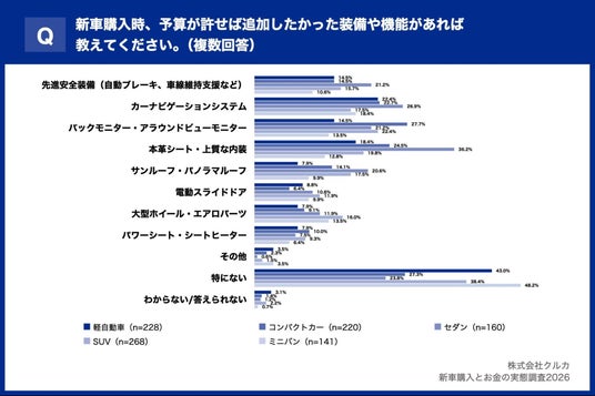 株式会社クルカは、直近3年以内に新車を購入し、購入時の意思決定に関与した方 1,076名を対象に、新車購入とお金の実態調査2026を実施しましたので、お知らせいたします。本リリースでは、車のカテゴリ別に見た「妥協した点と"本当は欲しかった装備"のズレ」を分析した結果をお知らせいたします。