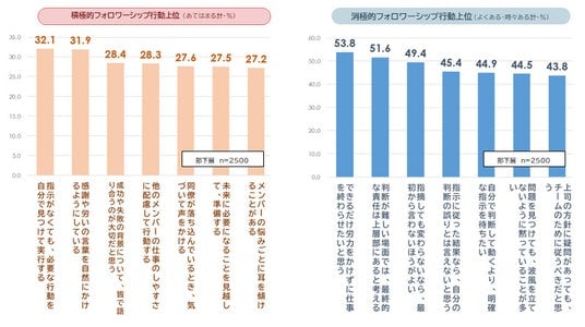 1. 部下の積極的なフォロワーシップと消極的なフォロワーシップ:部下のフォロワーシップとして、「指示がなくても必要な行動を自ら見つけて実行する」「感謝や労いの言葉をかける」といった積極的行動は3割超で見られる一方、「できるだけ労力をかけずに仕事を終わらせたい」「最終判断は上司の責任と考える」といった消極的行動も5割超で確認された。