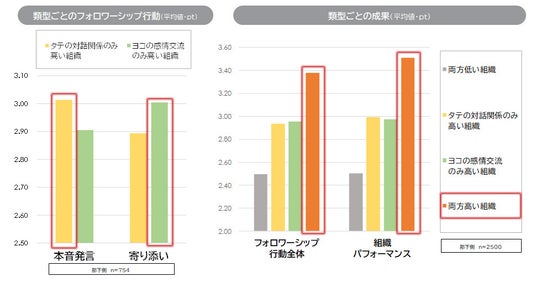 タテの対話関係とヨコの感情交流という2つの要素の高低をもとに、4つの類型に分類して分析した。ヨコの感情交流だけが強い職場は、寄り添いは盛んだが本音の意見がでず、いわば「仲の良いだけの組織」である。タテの対話関係だけが強い職場は、批判的意見はでるものの、感情的な寄り添いが広がっていない。2つの要素がともに高い組織が、圧倒的にパフォーマンスが高い(回帰分析の結果、2要素間に交互作用あり)。