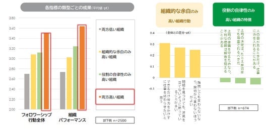 2つの特徴(「組織的余白」「役割の自律性」)は、ともに高い組織のほうがパフォーマンスが高い。組織的な余白のみが高い組織は、必要以上の労力をかけず、建設的意見がでにくい傾向にある。役割の自律性のみ強い職場は、上司の目線を気にした行動がやや出やすい傾向にある。