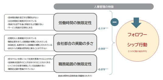 「労働時間の無限定性」「会社都合の異動の多さ」「職務範囲の無限定性」という、いわゆる日本的な雇用習慣がフォロワーシップ行動を縮小させていることが示された。