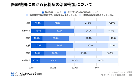 医療機関での花粉症治療の有無について、「毎年治療している」と回答した人は15.1%、「症状がひどい時だけ治療している」と回答した人は29.8%で、医療機関を受診している人は44.9%にとどまりました。全世代で医療機関を受診している人が半数以下で、花粉症における受診意欲が低いことがわかりました。