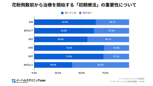 花粉症は、花粉が飛散する前や症状が少しでも現れた時点で治療を開始する「初期療法」が重要で、約65%の人が初期療法の重要性を知っていました。しかし、実際に医療機関で花粉症の治療を行っている人は約45%にとどまる結果となり、「認知」と「行動」の間に大きなギャップがあることが明らかになりました。