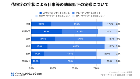花粉症の症状によって仕事等の効率が「とても下がっている」と感じる人は23.0%、「少し下がっている」と感じる人は59.0%でした。世代別で大きな違いはなく、全世代で効率低下を実感している現状が明らかになりました。
