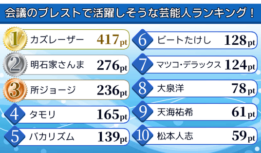 回答者には第1位~第3位まで芸能人の名前を挙げてもらい、順位に応じたポイント(1位=3pt、2位=2pt、3位=1pt)で集計しています。