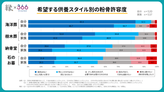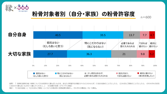自身および家族のいずれについても拒否感を示した層(「抵抗があり、できれば避けたい」「絶対に避けたい」と回答した人)はそれぞれ2割以下となり、残る8割超が「粉骨」を受容している実態が明らかになりました。