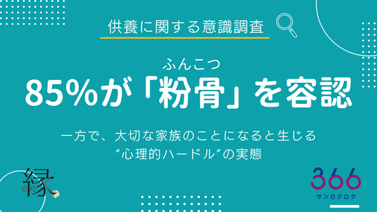 海洋葬・粉骨サポートを展開する有限会社 縁(本社:鹿児島県鹿児島市、代表取締役:堤裕加里)と、寺院支援と樹木葬開発を手がける株式会社366(本社:東京都港区、代表取締役:伊藤照男)は、2026年1月21日、40代~70代の男女600名を対象に「粉骨」に対する意識調査を実施。その結果、自己および家族の粉骨を拒否する層は2割以下に留まり、全体の8割超が「粉骨」という選択肢を許容している実態が判明しました。こうした傾向は、海洋葬や樹木葬などの自然葬を希望する人だけでなく、伝統的な石のお墓を希望する人の5割超も「粉骨」に「抵抗なし」と答えており、粉骨が供養の新しい選択肢として柔軟に受け入れられていると見られます。一方で、家族の粉骨には慎重になる「意識のギャップ」も浮き彫りになっており、利便性だけでは割り切れない現代人の供養観が明らかになっています。