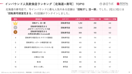 業界最大級のインバウンドビジネスメディア「訪日ラボ」及び 店舗向け集客一元化プラットフォーム「口コミコム」を運営する株式会社mov(代表取締役:渡邊 誠、本社:東京都渋谷区、以下mov)は、北海道の寿司店に寄せられた最新の口コミデータから、独自の『インバウンド人気飲食店ランキング』を発表しました。
