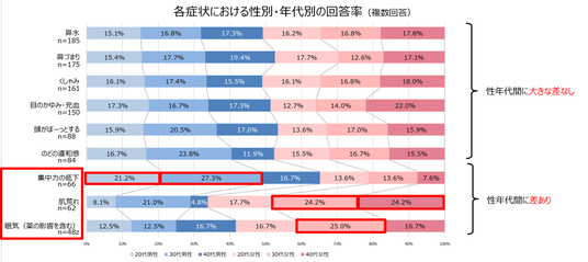 また、それぞれの症状において性別・年代別に回答率を見たところ、上位の症状には性年代間で大きな差がない一方で、下位の「集中力の低下」、「肌荒れ」、「眠気」については性年代間で異なる特徴が見られました。