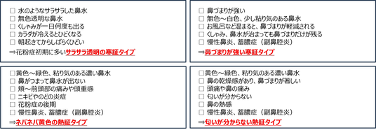 漢方薬も、症状や体質にあわせて使い分けを行うことが大切です。以下の花粉症セルフチェックで、あなたの症状が何タイプか確認してみましょう。