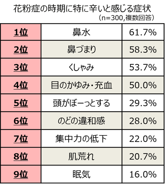 花粉症の人の半数以上が代表的な症状にお悩み/「集中力の低下」は男性に多く、「肌荒れ」「眠気」は女性に多い傾向