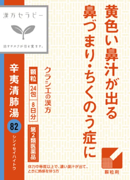 辛夷清肺湯(しんいせいはいとう) 「辛夷清肺湯」は、こもった熱を発散させて鼻の炎症を鎮めて、患部で発生する膿を抑えることで鼻通りを良くし、鼻づまり、慢性鼻炎や蓄膿症(副鼻腔炎)を改善します。また、呼吸器を潤す作用もあるため鼻の乾燥感が強い方に向いていて、鼻づまりの強い方の症状に効果を発揮します。