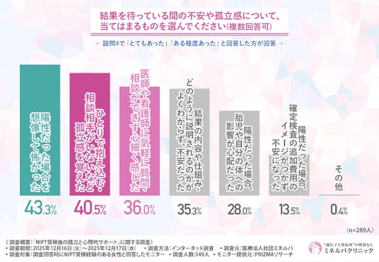 特に、「医師や看護師に相談できない心細さ」が約4割となり、NIPTの実施プロセスにおいて受検者への心理的フォローが不足している可能性を示しています。