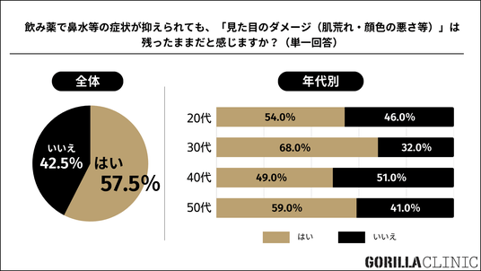◎見た目のダメージ、約6割が解決できず→飲み薬で鼻水などの症状が治まっても、「見た目のダメージは残ったままだ」と感じる人は57.5%と過半数を占めました。特に30代では68.0%と高い数値を示しています。