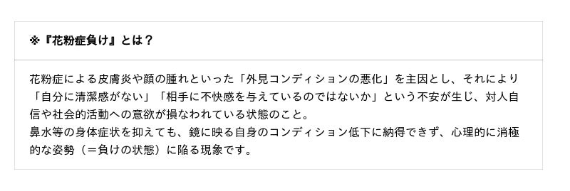 なお、本リリースでは花粉によって引き起こされる「身体的な苦痛」と、外見の損壊による「心理的停滞」、この二重の負担が招く「自信の喪失」を『花粉症負け(※)』と定義。