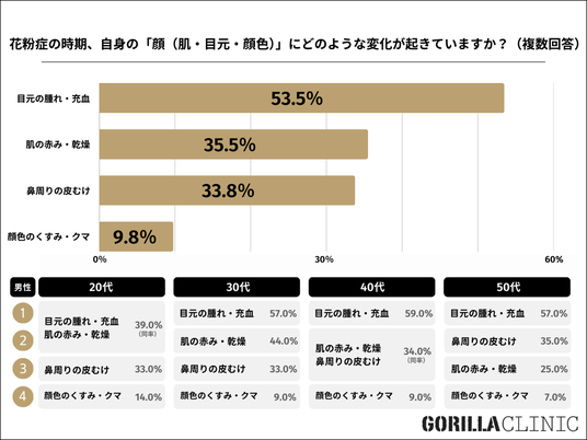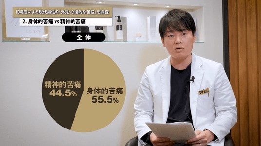 しかしながら来院される男性患者さまと対話していると、ビジネスやソーシャルな場面においてマスクを着用せずに対面する機会が増える中で、花粉症が理由で起こる肌荒れや顔立ちの変化による「清潔感の損失」や、それら「外見悪化による精神的苦痛(ストレス)」が、男性の社会的な自信を著しく損なっている実態が見受けられます。(太田医師・談)】