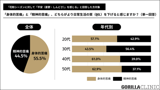 ● 「花粉症によって身体的苦痛と精神的苦痛、どちらがQOLを下げるか」の問いには、鼻水などの「身体的苦痛」と回答した人が55.5%で過半数を占めるも、44.5%が「外見悪化などによる精神的苦痛(ストレス)」を感じていると回答。