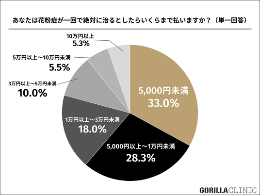 ◎「絶対に治るなら払いたい」。4割弱が1万円以上の投資意欲→花粉症が絶対に治るとした場合の支払額については、「5,000円未満(33.0%)」や「5,000円~1万円未満(28.3%)」という現実的な価格帯がボリュームゾーンですが、合計すると約4割(38.8%)の人が1万円以上の金額を支払う意思を示しました(1万円以上~30万円以上の合計)。毎年の苦しみから解放されるのであれば、高額な対価を払ってでも解決したいという切実なニーズが存在します。