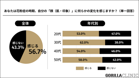 ◎過半数が自身の「顔の変化」を自覚。30代では6割超え→花粉症の時期、自分の顔に何らかの変化を感じるかという問いに対し、全体で56.7%が「感じる」と回答。ここでも30代の数値が突出しており、62.0%が変化を自覚しています。ビジネスシーンでの対面機会が多い年代ほど、自身の外見コンディションの揺らぎに対して敏感になっていると考えられます。