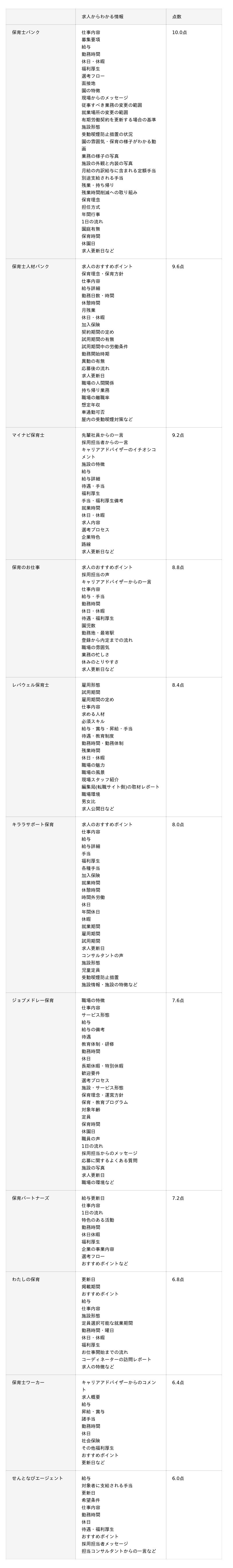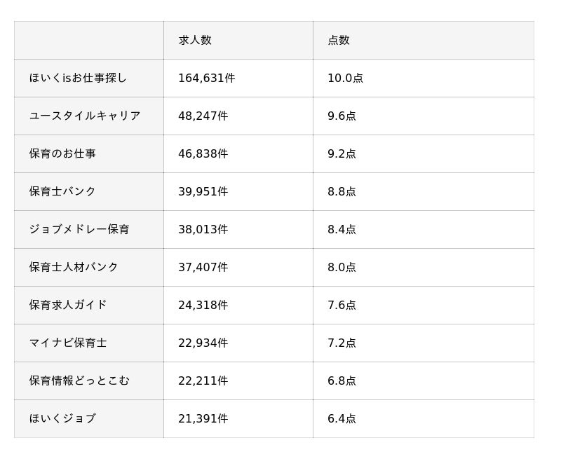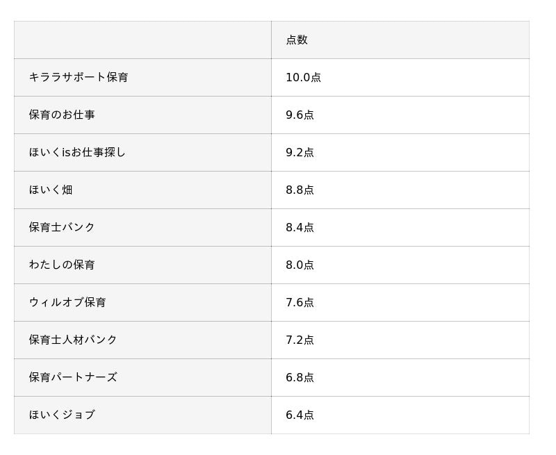 求人数を評価する際は保育求人が多い転職サイトを10点として、保育求人が少ないほど点数を低く設定しています。
