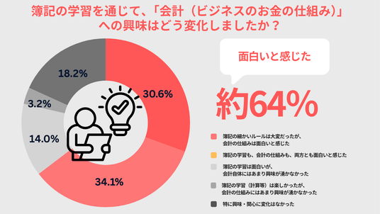 学習を通じて「会計(ビジネスのお金の仕組み)」への興味がどう変化したかについては、64.7%が「面白いと感じた」と回答。簿記の学びを通じてその先にある会計の仕組みに興味が広がっている様子が伺えます。