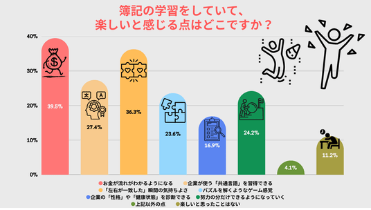 1. 学びそのものの楽しさを感じられるのが、「簿記」の学習。簿記の学習において「楽しいと感じる点」を調査したところ、「お金の流れがわかる(39.5%)」に次いで、「左右が一致した瞬間の気持ちよさ(36.3%)」が上位にランクイン。「努力の分だけできるようになっていく(24.2%)」、「パズルを解くようなゲーム感覚(23.6%)」という回答も多く、学びそのものを楽しいと感じている簿記学習者が多いことがわかりました。