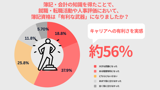 楽しさだけでなく、実利面でも高い評価を得ています。56.7%(「大きな武器になった」「ある程度有利になった」の合算)が、就職・転職活動や人事評価において有利に働いたと回答。不透明な雇用環境において、客観的な証明となる簿記の強さが示されました。