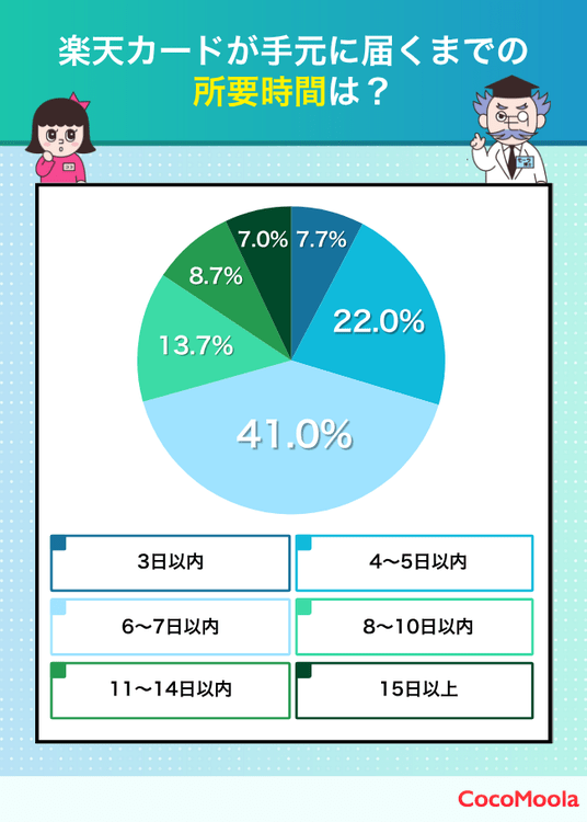 - 楽天カードの発行スピードは、41%が「6~7日以内」と回答。