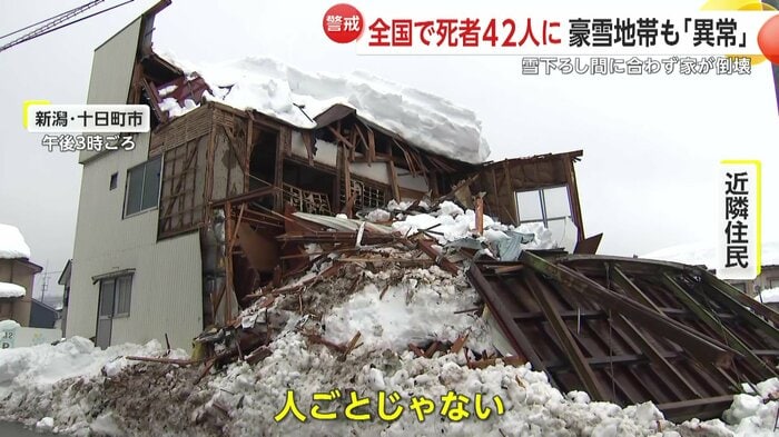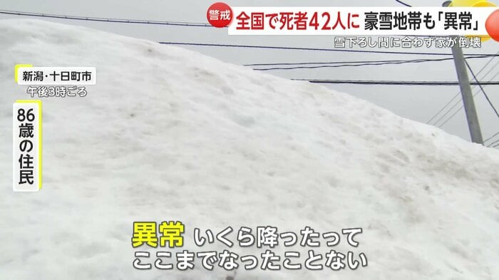 86歳の住民は驚いた様子で、今回の雪について「異常、いくら降ったってここまでなったことない」と話し、「(雪下ろしは)とても屋根上がることできないからさ…」という。