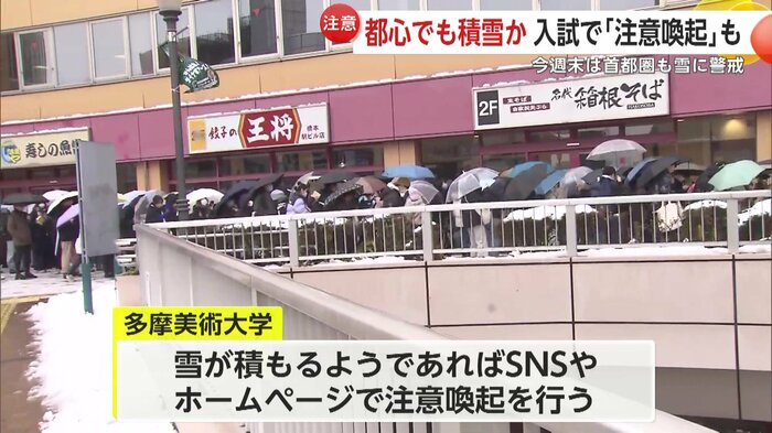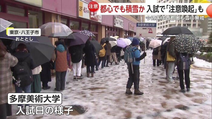 2024年、八王子市にある多摩美術大学の入試日に雪が降った際の映像では、雪で路面の状態が悪い中、たくさんの人が並んでいる様子が確認できる。