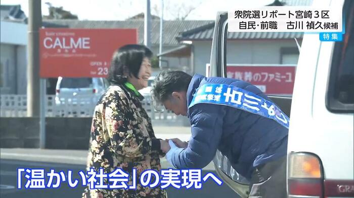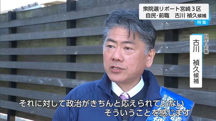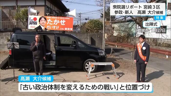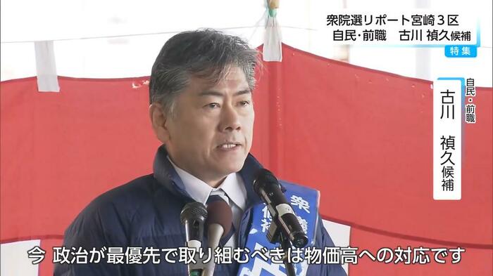 衆議院選挙の宮崎3区には、届け出順に参政党・新人の高瀬大介(たかせ・だいすけ)候補と、9期目を目指す自民党・前職の古川禎久(ふるかわ・よしひさ)候補の2人が立候補している。