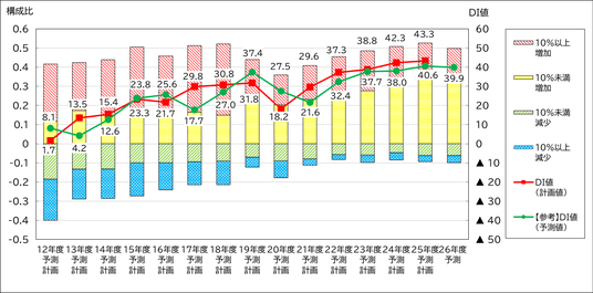 *2:DI値(計画値)は、前年度の予算に対する当該年度予算の伸び率を元に算出、DI値(予測値)は、翌年度IT予算の増減傾向予測を元に算出しています。