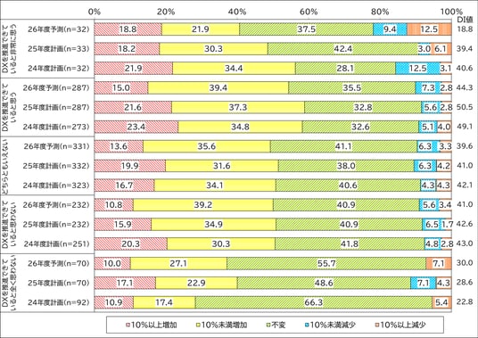 IT予算のDI値が5年連続で上昇、26年度も上昇傾向続く見込み。「AI関連の投資・利用料増加」によるIT予算増加に注目。