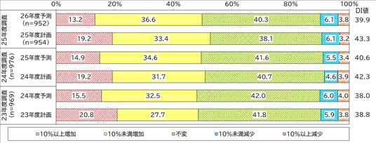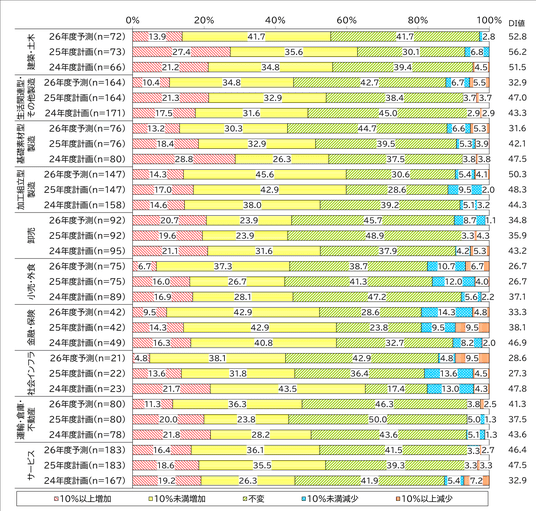 業種グループ別では、「建築・土木」のDI値が25年度計画で56.2ポイントと、24年度以降一貫して全業種で最も高い水準を維持しています。また、「サービス」は24年度計画(32.9ポイント)から25年度計画(47.5ポイント)へ14.6ポイント増と、今期最も大きく伸長しました。