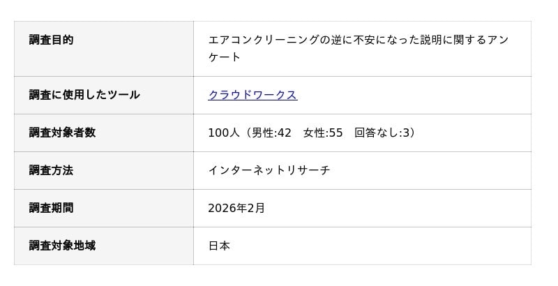 おうちにプロでは、エアコンクリーニングでお悩みの方により有益な情報を提供するために、「エアコンクリーニングの逆に不安になった説明に関する独自調査」を実施しました。アンケート調査の概要は以下の通りです。